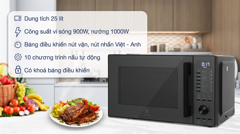 Lò vi sóng có nướng Electrolux EMG25D22BM, dung tích 25 lít, là sự lựa chọn hoàn hảo cho gia đình bạn với các đặc điểm nổi bật sau: