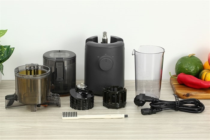 Đi kèm sản phẩm còn có ca đựng nước ép và bàn chải vệ sinh tiện lợi.