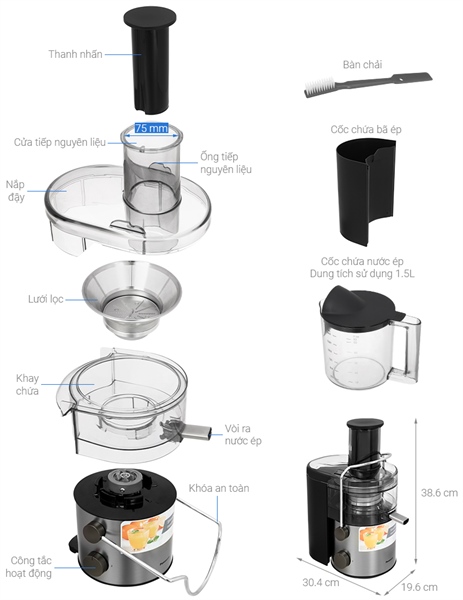 | Dung tích: | Cốc chứa bã: 2 lít, Cốc đựng nước ép: 1.5 lít |
