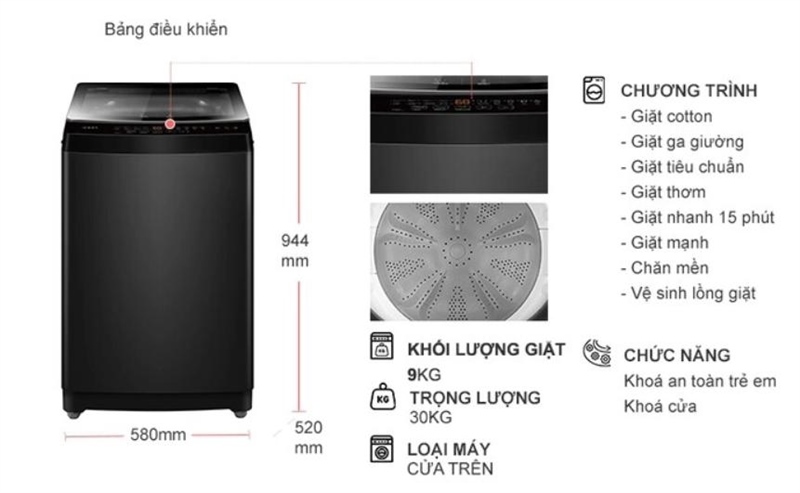 - Khối lượng giặt 9kg, phù hợp với nhu cầu giặt giũ của gia đình 3 - 5 thành viên.