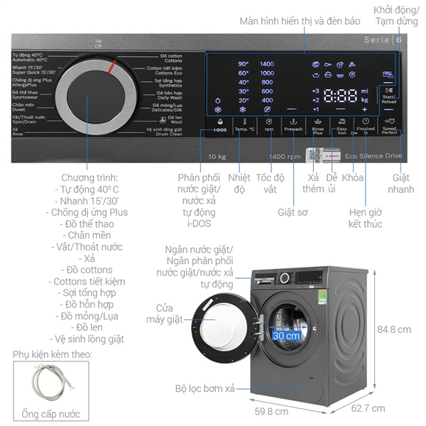 - Mẫu máy giặt Bosch này có khối lượng giặt 10 kg, đáp ứng nhu cầu sử dụng cho các hộ gia đình từ 5 - 7 người.
