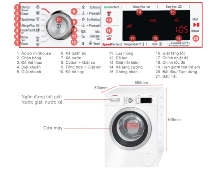 - Máy giặt Bosch có 14 chương trình giặt giũ được cài đặt sẵn, ví dụ như: giặt chăn ga, giặt sơ đồ tổng hợp, áo sơ mi, đồ hỗn hợp, giặt nhanh 15 phút, xả + vắt,... (xem thêm tại bảng thông số kỹ thuật) tùy theo từng loại đồ dùng, trang phục mà bạn lựa chọn chương trình giặt phù hợp để giặt sạch quần áo đồng thời tiết kiệm điện, nước hơn.
