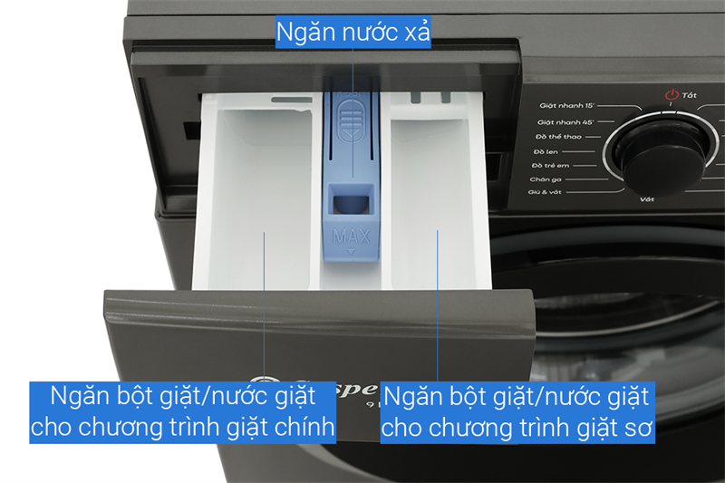 - Bảng điều khiển tiếng Việt dễ sử dụng, màn hình hiển thị rõ ràng, tích hợp núm xoay chọn chương trình giặt và nút nhấn điều chỉnh các thông số khác dễ dàng, kể cả người lớn tuổi.