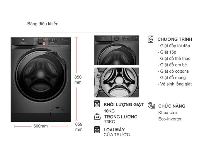 - Máy giặt cửa trước 10 kg phù hợp với nhu cầu giặt giũ của gia đình từ 5 đến 7 thành viên.
