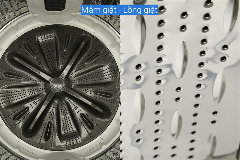 - Lồng giặt thiết kế rộng, trơn cho bạn thoải mái làm sạch các món đồ kích cỡ lớn như ga trải giường, rèm màn, cánh mâm xoay thẳng đứng giúp tạo luồng nước mạnh, chà xát quần áo vào nhau, tăng hiệu quả giặt đồ. Chất liệu inox hạn chế oxy hóa, sử dụng bền tốt, có tính thẩm mỹ cao.