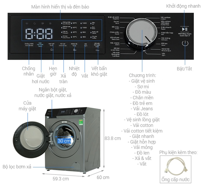 • Tiện ích: Vệ sinh lồng giặt, Khóa trẻ em, Hẹn giờ giặt, Chống nhăn