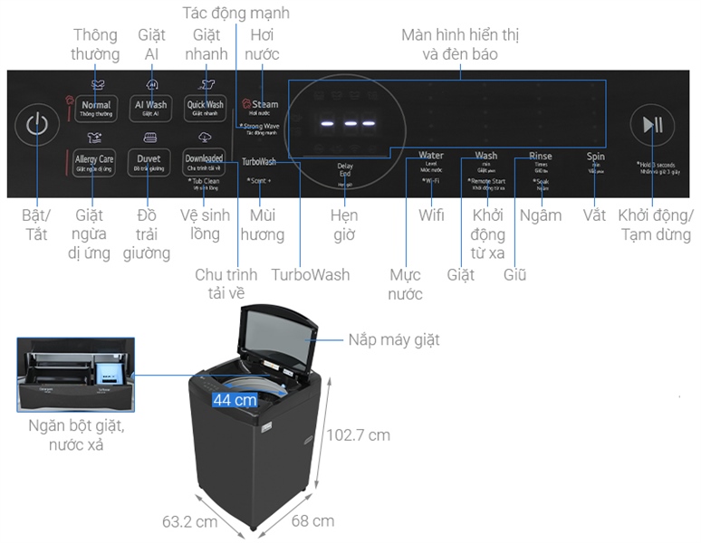 • Chương trình: Turbowash, Giặt AI, Chương trình lưu hương Scent+, Đồ trải giường, Vệ sinh lồng giặt, Giặt nhanh, Giặt ngừa dị ứng, Giặt hơi nước, Chu trình tải về, Giặt thông thường