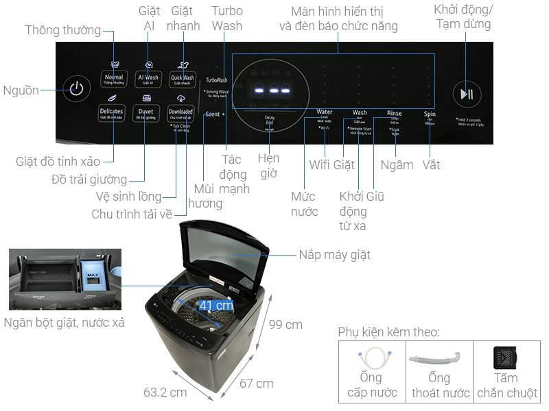 Chương trình giặt:Chu trình tải về, Giặt AI, Giặt sơ + Thông thường, Giặt chăn ga, Giặt nhanh, Vệ sinh lồng giặt, Đồ tinh xảo