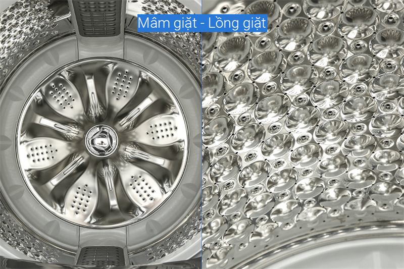 - Lồng giặt được làm từ thép không gỉ sáng bóng, chống oxy hoá và ăn mòn tốt, đồng thời hạn chế mảng bám từ cặn bột giặt và vi khuẩn tích tụ trong máy, đảm bảo hiệu suất giặt đồ tốt cho những lần sau.