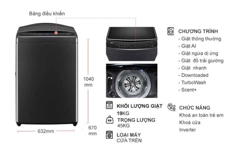 - Máy giặt LG AI DD Inverter 19 kg TV2519SV7J là dạng máy giặt lồng đứng - cửa trên thiết kế tinh tế, với màu đen chủ đạo thích hợp với những gian bếp cá tính.