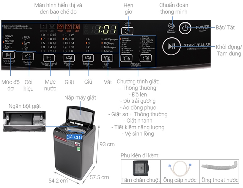 Tiện ích:Chẩn đoán lỗi Smart Diagnosis. Hẹn giờ giặt. Khóa trẻ em. Chế độ giặt sơ tự động