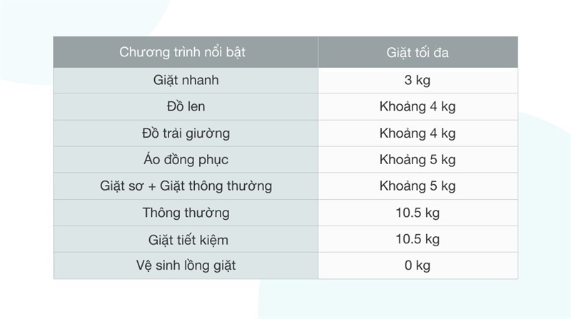 Chương trình giặt:Giặt chăn ga. Giặt nhanh. Giặt sơ. Giặt thường. Tăng hiệu quả giũ. Vệ sinh lồng giặt. Áo đồng phục. Đồ len