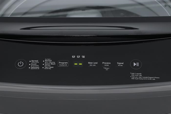 Bảng điều khiển cảm ứng, có chú thích song ngữ Anh – Việt, giúp người dùng dễ dàng thao tác và lựa chọn chương trình giặt phù hợp.