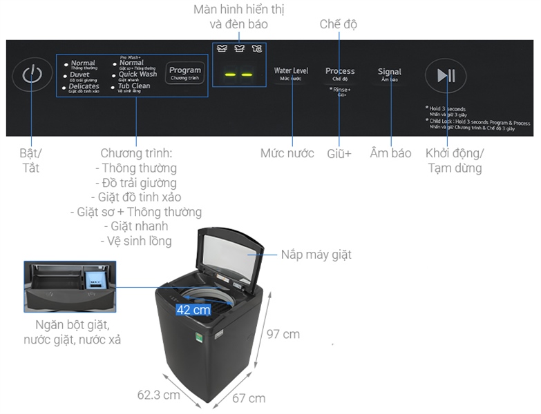 - Loại máy giặt: Cửa trên - Lồng đứng