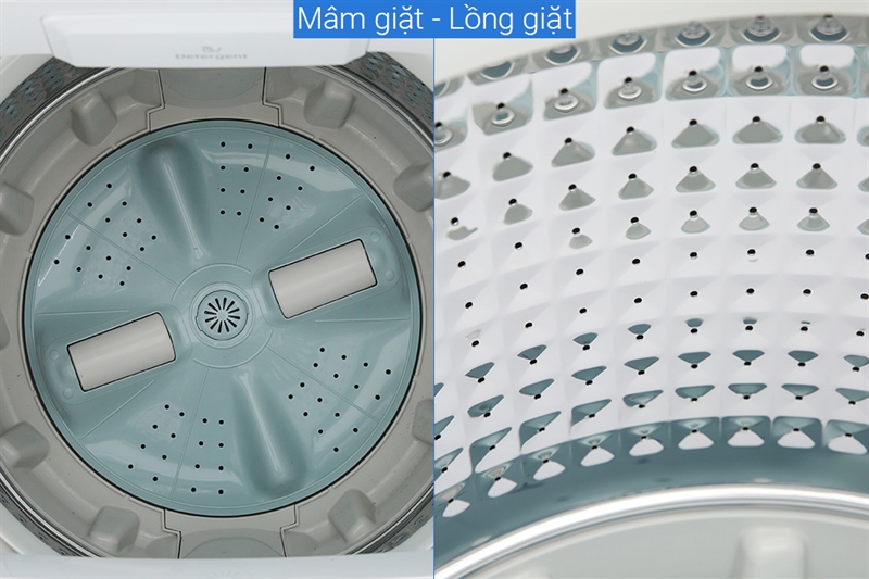 - Lồng giặt được làm từ thép không gỉ, hạn chế mảng bám, vi khuẩn sinh sôi trong môi trường ẩm ướt gây ra mùi hôi khó chịu. Thiết kế các lỗ thoát nước nhỏ cùng các gờ nổi hình kim cương làm giảm ma sát giữa quần áo và lồng giặt.