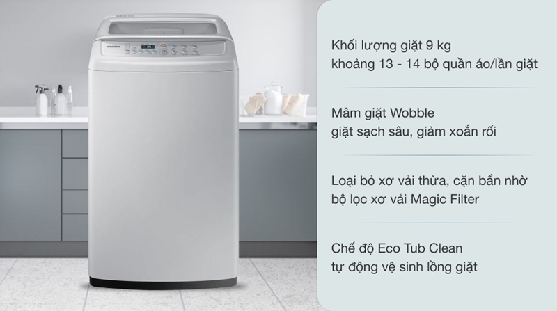 - Khối lượng giặt tối đa 9 kg, đáp ứng tốt nhu cầu giặt giũ của gia đình có từ 3 - 5 thành viên hoặc các gia đình có ít thành viên hơn nhưng nhu cầu giặt giũ hàng ngày cao, với khối lượng quần áo lớn.