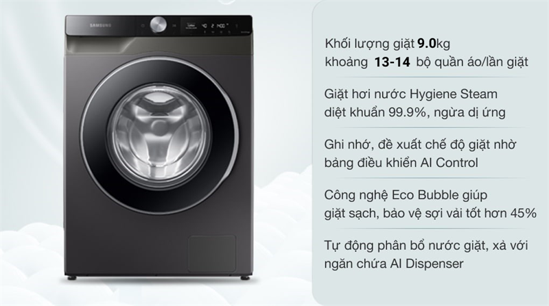· Công nghệ giặt: | AI Dispenser tự động cân chỉnh lượng nước giặt, nước xả. Bảng điều khiển AI control tự động ghi nhớ chế độ giặt. Chế độ giặt Super Speed. Công nghệ giặt bong bóng Eco Bubble. Giặt hơi nước Hygiene Steam diệt 99.9% vi khuẩn. VRT Plus ™ giảm rung ồn đến 30% |