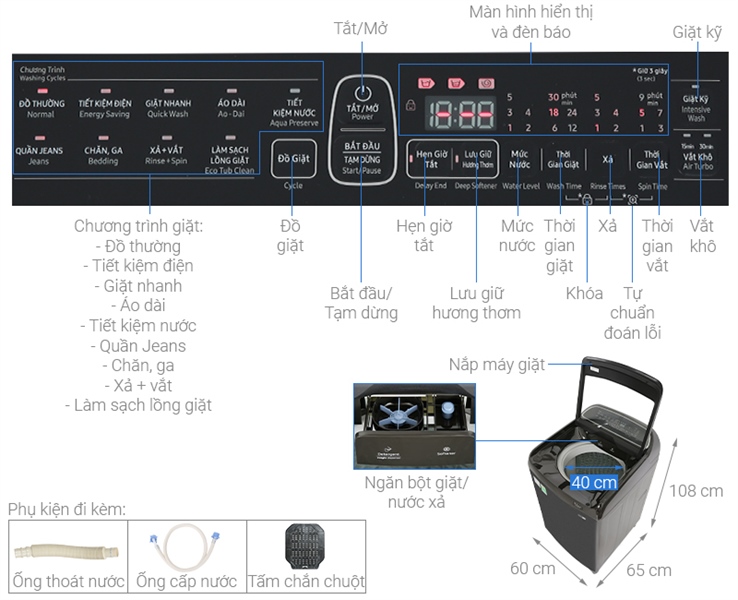 · Chương trình giặt: | Giặt chăn ga. Giặt nhanh. Giặt thường. Giặt tiết kiệm. Giặt áo dài. Tiết kiệm nước. Vệ sinh lồng giặt. Xả + vắt. Đồ Jeans |
