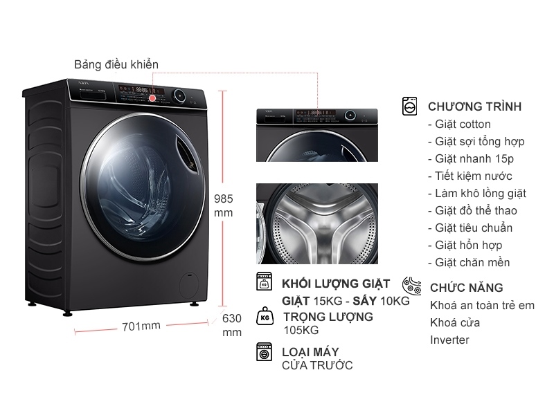 - Khối luợng giặt 15 kg - sấy 10 kg phù hợp cho gia đình trên 7 nguời.