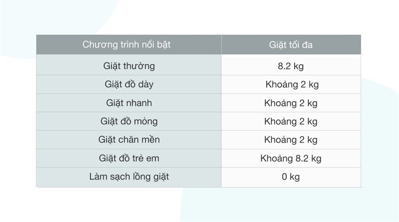 Máy giặt có khối lượng 8.2 kg, phù hợp cho gia đình có từ 3 - 5 thành viên hoặc ít người hơn nhưng có nhu cầu giặt 1 lần nhiều đồ.