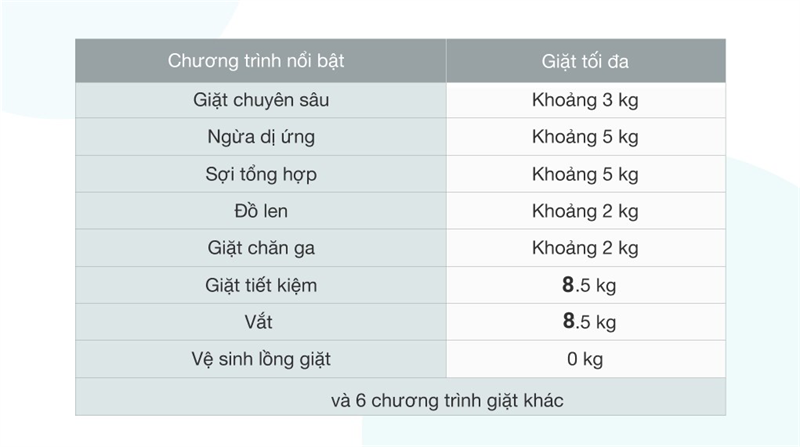 Chương trình giặt:Giặt chuyên sâu. Ngừa dị ứng. Sợi tổng hợp. Vắt cực nhanh. Giặt chăn ga. Giặt ngừa dị ứng. Giặt tiết kiệm. Vắt. Vệ sinh lồng giặt. Xả + vắt. Đồ len. Đồ mỏng. Đồ thể thao. Đồ tối màu
