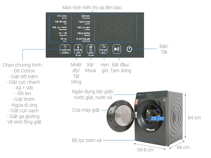 Tiện ích:Giặt nhanh 15 phút. Giặt nước nóng tới 90 độ C. Hẹn giờ giặt. Khóa trẻ em. Thêm đồ trong khi giặt. Tự khởi động lại khi có điện. Vệ sinh lồng giặt