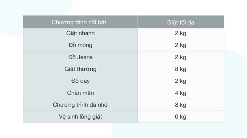 · Chương trình giặt: | Chăn mền. Ghi nhớ chương trình giặt. Giặt nhanh. Giặt thường. Vệ sinh lồng giặt. Đồ dày. Đồ Jeans. Đồ mỏng |