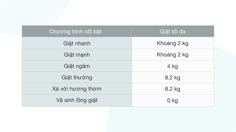 · Chương trình giặt: | Giặt mạnh, Giặt ngâm, Giặt nhanh, Giặt thường, Vệ sinh lồng giặt, Xả hương thơm |