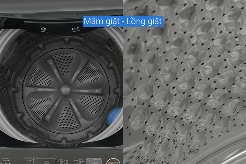 - Lồng giặt được thiết kế với dạng các gờ nổi hình ngôi sao, xen kẽ đó là các lỗ nhỏ dẫn nước khắp lồng giặt, tác động lên quần áo tạo ra hiệu ứng chà xát quần áo như giặt tay, tránh làm hư tổn quần áo. Ngoài ra, lồng giặt được làm bằng thép không gỉ giúp hạn chế mảng bám và vi khuẩn sinh sôi trong quá trình sử dụng.