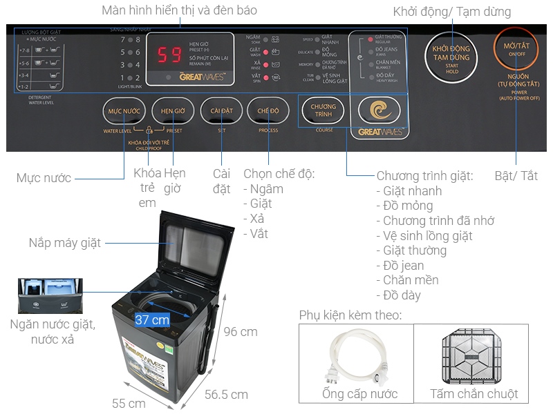 Công nghệ giặt đặc biệt- Greatwaves kết hợp 3 luồng nước xoay ngang 2 chiều, đập xuống, phun từ dưới lên giúp quần áo được giặt sạch hơn, tiết kiệm thời gian, hạn chế hư tổn sợi vải.