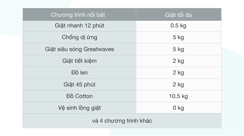 · Chương trình giặt: | Ghi nhớ chương trình giặt, Giặt 45 phút, Giặt chăn ga, Giặt ngừa dị ứng, Giặt nhanh 12 phút, Giặt siêu sóng Greatwaves, Giặt tiết kiệm, Vắt, Vệ sinh lồng giặt, Đồ cotton, Đồ hỗn hợp, Đồ len |