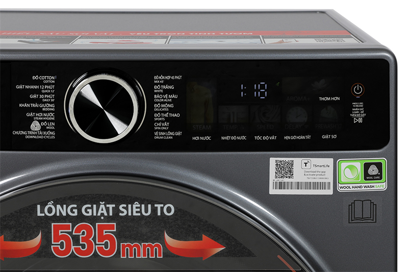 · Tiện ích: | Vòng đệm cửa kháng khuẩn Van sử dụng mực nước thấp Thêm đồ trong khi giặt Kết nối Wifi và điều khiển từ xa bằng điện thoại thông minh qua phần mềm TSmartLife Khóa trẻ em Hẹn giờ giặt kết thúc Chỉnh số vòng vắt Chỉnh nhiệt độ nước Vòi phun 360° rửa sạch mặt trong cửa và vòng đệm cửa |