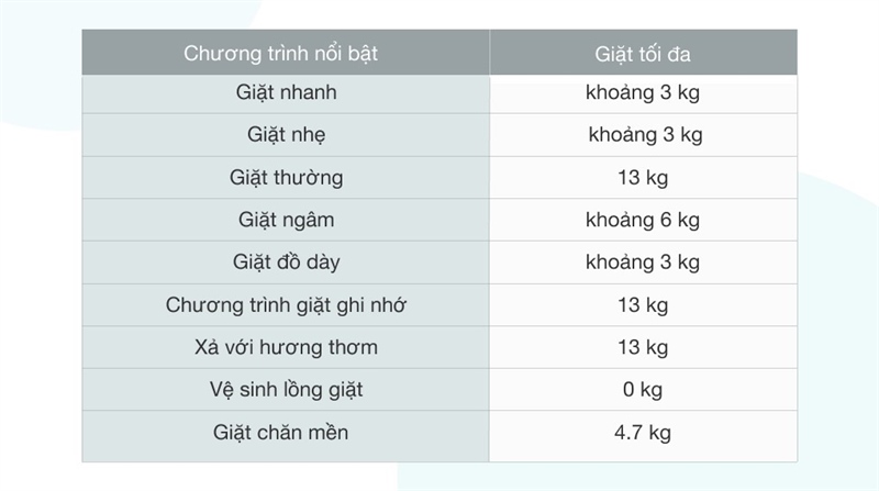 · Chương trình giặt: | Chăn mền. Ghi nhớ chương trình giặt. Giặt ngâm. Giặt nhanh. Giặt nhẹ. Giặt thường. Vệ sinh lồng giặt. Xả hương thơm. Đồ dày |