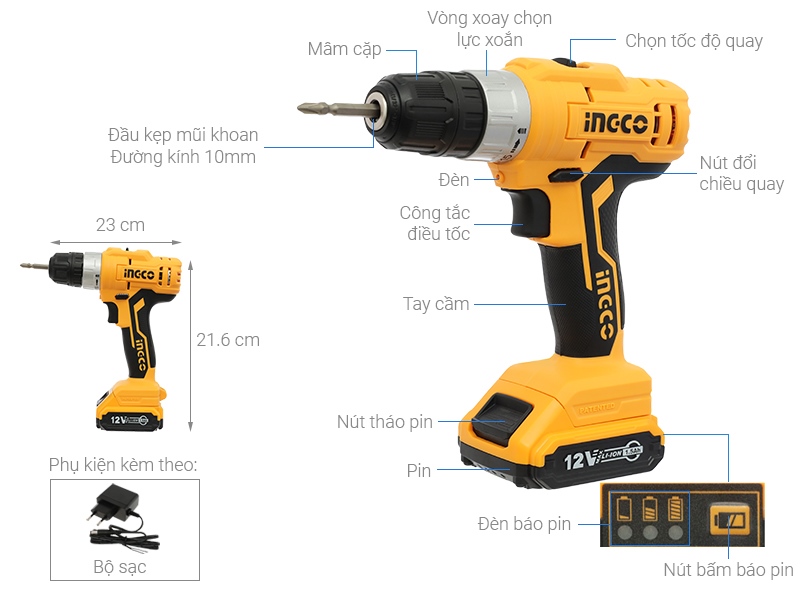 Thông số kỹ thuật Máy khoan vặn vít pin Ingco CDLI1221 12V