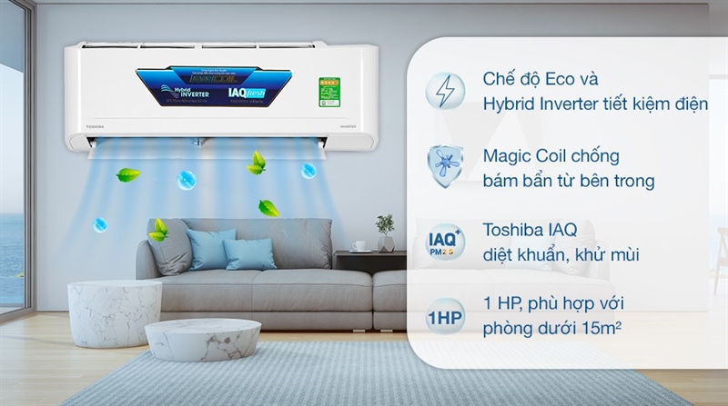 Công nghệ tiết kiệm- Hybrid Inverter giúp máy lạnh Toshiba hoạt động ổn định, làm lạnh nhanh, tiết kiệm điện và vận hành êm ái với độ ồn chỉ 22 – 41/48 dB.