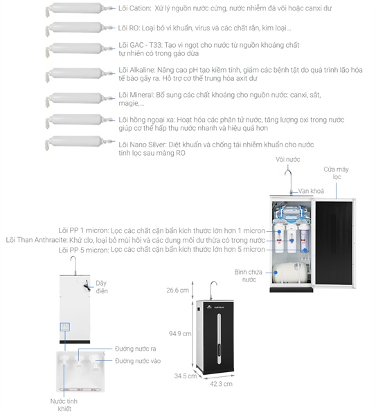 · Lõi chức năng: | Lõi 8: Mineral (Sx Việt Nam Lõi 9: Hồng ngoại xa (Sx Việt Nam) Lõi 6: GAC - T33 (Sx Việt Nam) Lõi 7: Alkaline (Sx Việt Nam) Lõi 10: Nano Silver (Sx Việt Nam) |