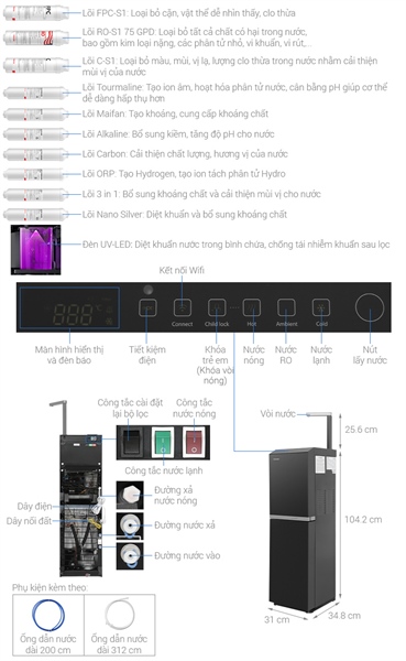 · Tiện ích | Tự động báo thay lõi Giàu Hydrogen chống oxy hóa Đèn UV diệt khuẩn Khóa vòi nóng an toàn Tạo nước kiềm (Alkaline) trung hòa axit cho cơ thể Điều khiển máy qua điện thoại Màn hình cảm ứng Chế độ cút nối nhanh dễ dàng thay lõi Ngừng hoạt động khi áp lực nước thấp Tự động xả nước thải Trung hòa độ pH ổn định độ ngọt cho nước Ngừng hoạt động khi nước đầy bình Cảm biến ánh sáng ECO giúp tiết kiệm điện Cảm biến chống tràn, rò rỉ nước Cảm biến chống quá nhiệt |