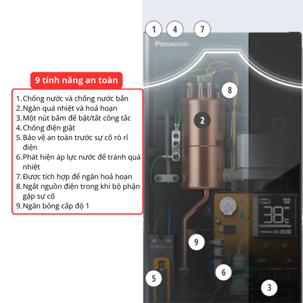 - Hệ thống ELCB chống giật: Có khả năng tự động ngắt điện khi xuất hiện tình trạng rò rỉ điện hoặc dòng điện vượt quá mức ngưỡng cho phép của máy nước nóng Panasonic được thiết lập.