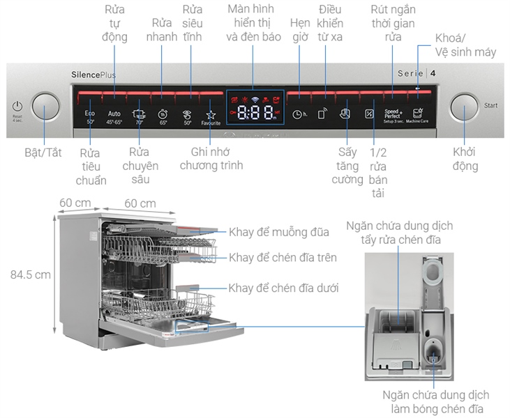 - Công nghệ Dosage Assistant hỗ trợ sức mạnh cho quá trình tẩy rửa chén bát và giảm bớt độ ồn khi thiết bị hoạt động tối ưu.