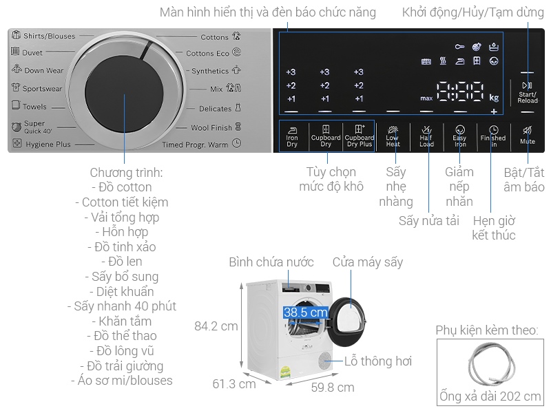 - Kiểu dáng: máy sấy lồng ngang - cửa trước.