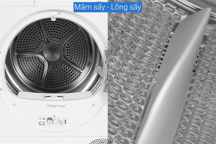 - Lồng sấy làm bằng thép không gỉ bóng bẩy, chống rỉ sét, mài mòn, hạn chế bụi bẩn, mảng bám, giúp nâng cao tuổi thọ cho thiết bị.