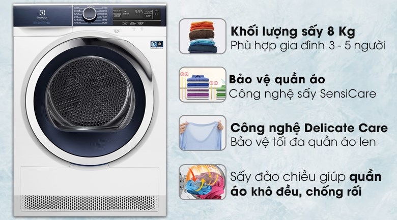Máy sấy Electrolux có khối lượng sấy 8 kg, phục vụ tốt cho gia đình có từ 3 – 5 người trong những ngày mưa lớn kéo dài hay nhà không có khu vực phơi đồ