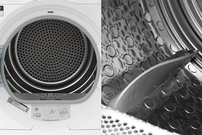 - Lồng sấy làm từ thép không gỉ bền bỉ, hạn chế ăn mòn, rỉ sét, giảm bám bụi bẩn, mảng bám, giữ quần áo khô, sạch, kéo dài tuổi thọ cho sản phẩm.
