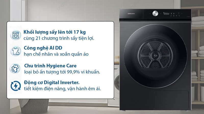 · Tiện ích: | Bảng điều khiển thông minh AI Control Chức năng Smart Check Công nghệ sấy diệt khuẩn Hygiene Care Công nghệ Wrinkle Prevent chống nhăn Hẹn giờ sấy Khóa trẻ em Kết nối điện thoại qua app SmartThings Tự động mở cửa Công nghệ sấy bơm nhiệt Hybrid Heatpump Công nghệ sấy thông minh AI Dry Sấy khô siêu tốc QuickDrive 35 phút Silent Dry vận hành êm ái, giảm ồn, chống rung đến 30% Cài đặt ngôn ngữ hiển thị Tiếng Anh hoặc Tiếng Việt |