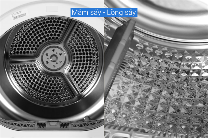 - Lồng sấy kim cương bằng thép không gỉ sáng bóng, hạn chế ăn mòn, biến dạng trong quá trình sử dụng, chất liệu này cũng giảm mảng bám, bụi bẩn nên giúp bạn vệ sinh đơn giản.