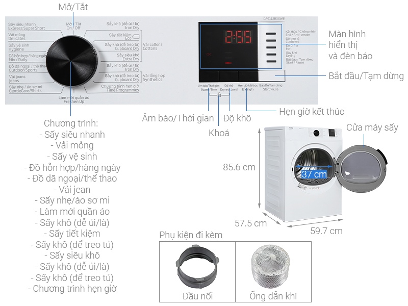 - Bảng điều khiển: máy sấy Beko này được tích hợp ngôn ngữ tiếng Anh lẫn tiếng Việt, dễ dàng thao tác với núm xoay lựa chọn chương trình sấy và màn LED hiển thị các thông số.