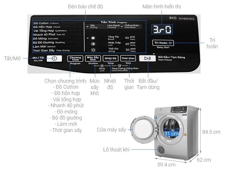 Thông số kỹ thuật Máy sấy thông hơi Electrolux 8 Kg EDV805JQSA 2019 - Thái Lan