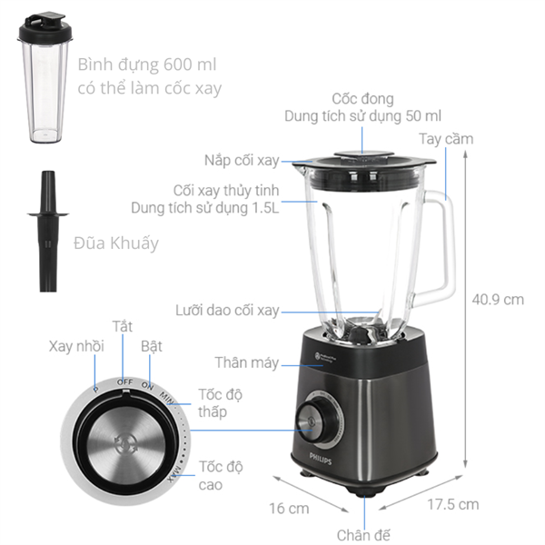 Máy xay sinh tố Philips được trang bị bảng điều khiển với nút xoay cơ học, giúp thao tác dễ dàng và điều chỉnh tốc độ chính xác chỉ với một thao tác vặn đơn giản.
