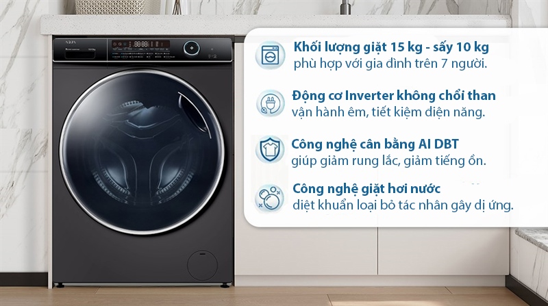 Máy giặt sấy Aqua Inverter giặt 15 kg - sấy 10 kg AQD-AH1500H PS 2024