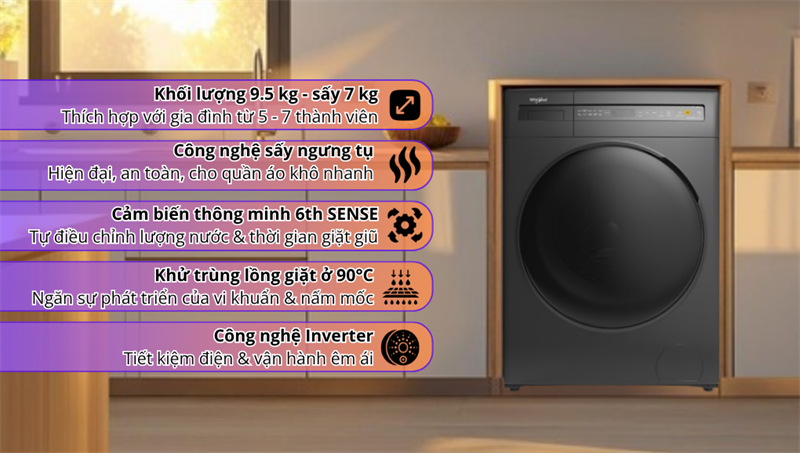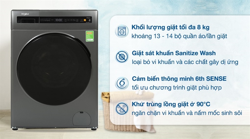 Máy giặt sấy Whirlpool SaniCare Inverter giặt 9.5 kg - sấy 7 kg WWEB95702FG